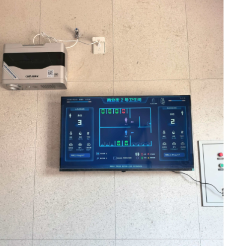 1、進入公廁我們就可以看到引導大屏,大屏上面顯示每個廁所的環境指數,坑位占用情況,紅綠表示占用,綠色表示空閑,信息一目了然。